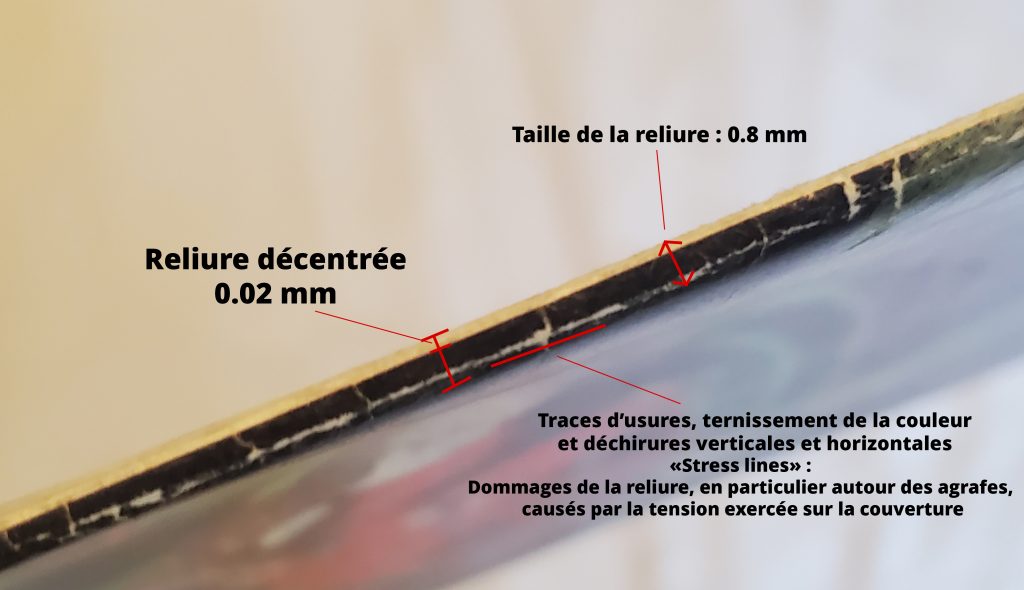 Lors de l’analyse des bords du comics, nous allons nous pencher sur la précision de découpe ( est ce que la couverture est décalée par rapport aux autres pages ? ), mais aussi sur l’état des bords en analysant les potentielles traces de décoloration, d’écaillement, d’effilochage, d’entailles…